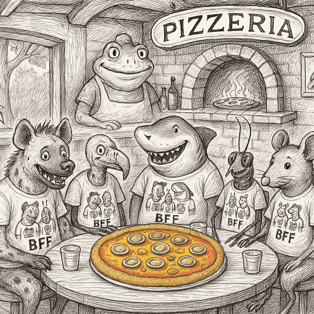 A hyena, a vulture, a shark, a cockroach and a rat were best friends.