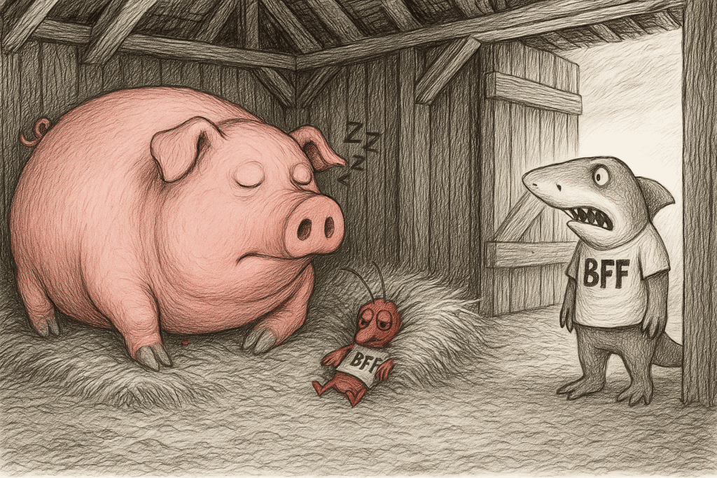 The cockroach was lying dead, squished under the pig when it collapsed.