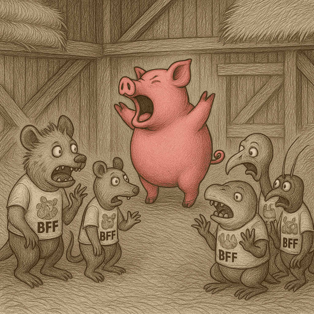 When they came back to the next morning, they were surprised to see the piglet had turned into a giant pig.